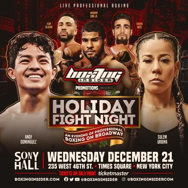 The Bronx’s undefeated Andy Dominguez will be the main event fighter for the first time in his young career in a fight card tabbed “Holiday Fight Night.” The event takes place Wednesday, December 21, just four days before Christmas, the best time of the year, at Sony Hall, in Times Square, New York City.