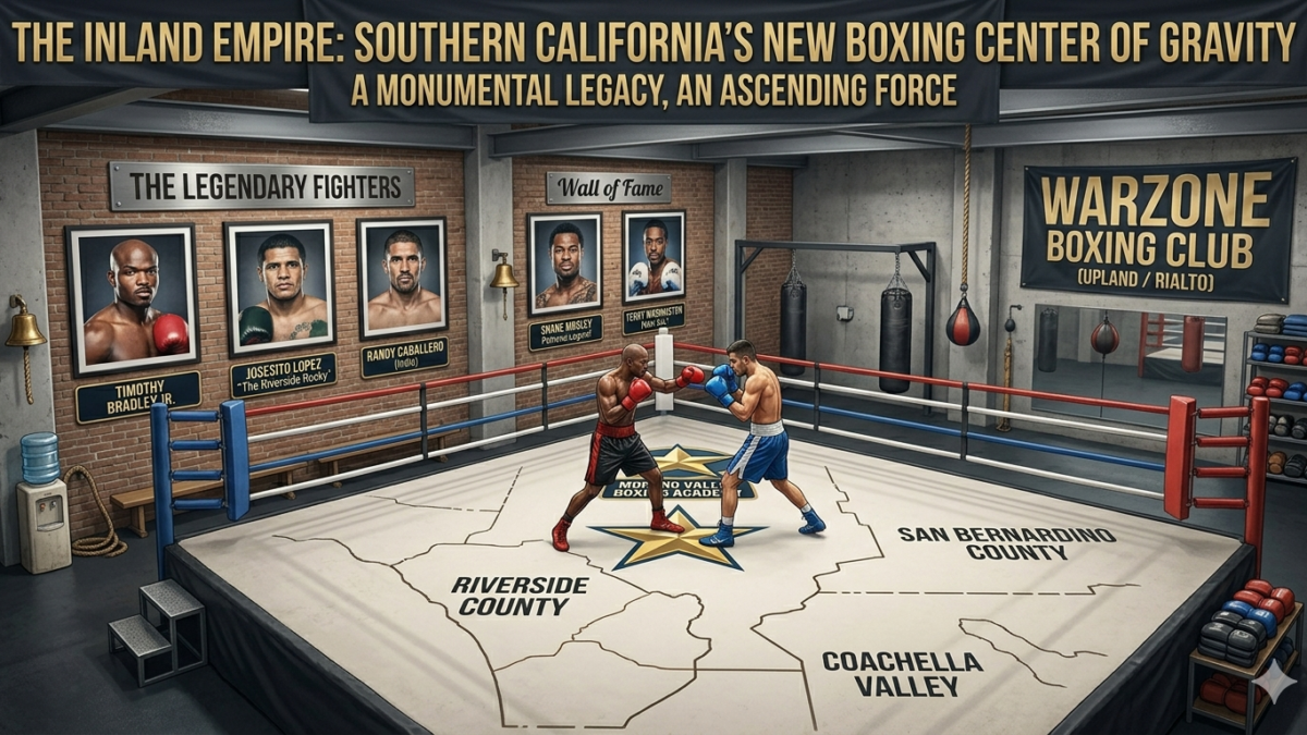 Stretching across Riverside and San Bernardino counties and down through the Coachella Valley, this sprawling region of 4.6 million people produces world champions at a rate that rivals any single city in America. Tim “Desert Storm” Bradley came out of Palm Springs and Cathedral City. Josesito “Riverside Rocky” Lopez built his career in Riverside. Randy “El Matador” Caballero captured a world title out of Coachella. Robert Garcia just moved his legendary academy from Oxnard to Moreno Valley, bringing the Oxnard pipeline east.