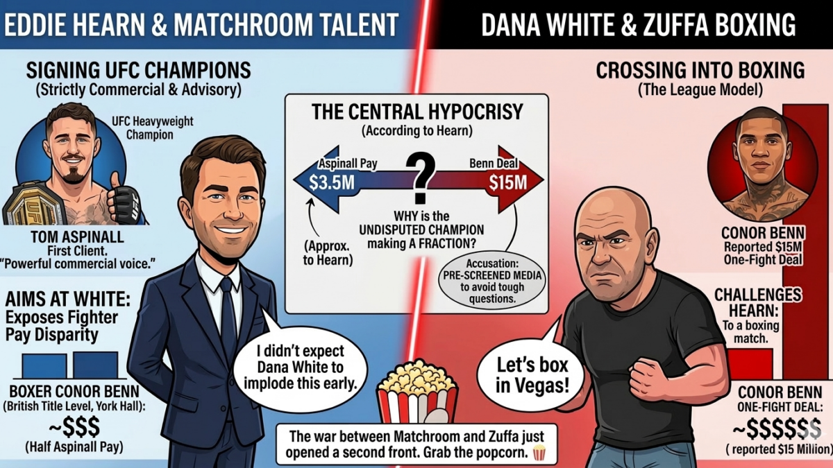 White took Hearn’s fighter. Hearn responded by taking White’s champion — not for boxing, but for management. Then he weaponized the fighter pay data he gained access to through that deal.