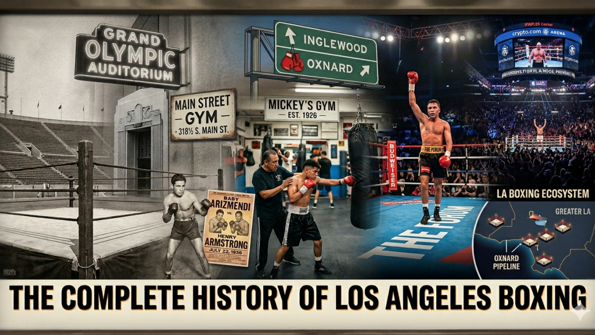 From the bloody weekly cards at the Grand Olympic Auditorium to the title fights at the Forum, from the Main Street Gym’s dark staircase to the Mexican-American fight culture that built the Olympic’s golden era, LA boxing is its own story. It’s a story of immigration and identity, of Hollywood glamour colliding with working-class violence, of venues that shaped how the sport was seen on television and fighters who rewrote what was possible inside the ring.