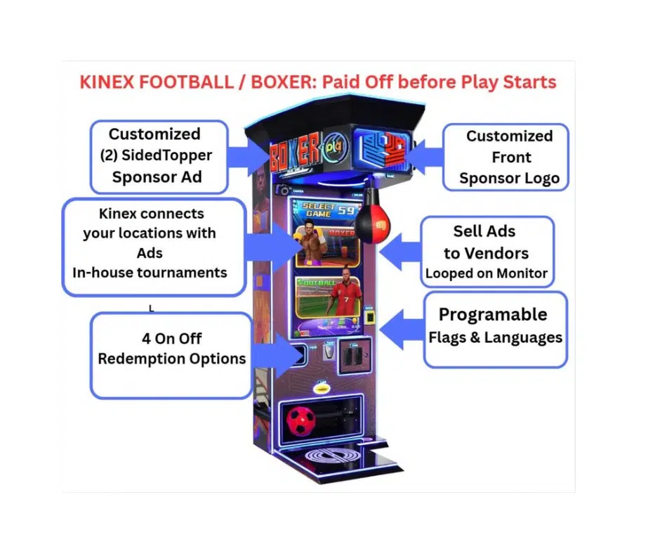 Built on a 992-pound base for stability during heavy shots, the KINEX also supports both boxing and football kicking modes. The system accepts all major payment methods and receives free quarterly software updates with new game modes and features.