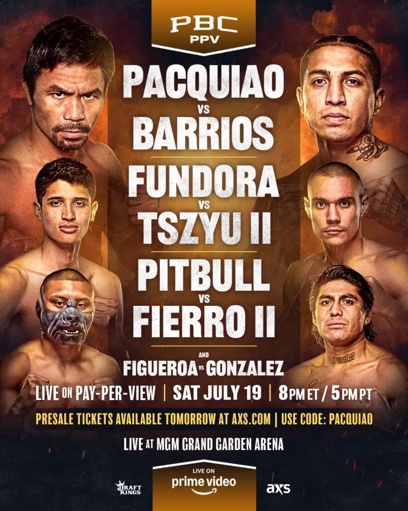 Las Vegas, NV – International Boxing Hall of Famer Manny “Pacman” Pacquiao will step back into the ring to challenge WBC Welterweight World Champion Mario “El Azteca” Barrios on Saturday, July 19, at the MGM Grand Garden Arena. The Premier Boxing Champions (PBC) Pay-Per-View, broadcast live on Prime Video, will feature a series of competitive bouts.