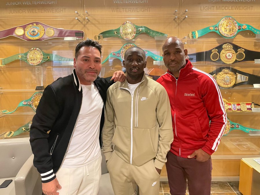 Golden Boy Promotions honcho, and Hall of Fame fighter, Oscar De La Hoya is working to sign WBO welterweight titlist Terence Crawford onto the roster. De La Hoya posted a pic of himself and Crawford, along with fellow Golden Boy Promotions honcho (and fellow Hall of Famer) Bernard Hopkins on Saturday night. De La Hoya then told Chris Mannix he’d like to see Crawford face Alexis Rocha. What’s more, De La Hoya made it clear he liked the idea of Crawford facing Virgil Ortiz after that. Lastly, and perhaps most importantly, De La Hoya said that he could make a much hoped for fight between Crawford and fellow welterweight titlist Errol Spence become a reality.
