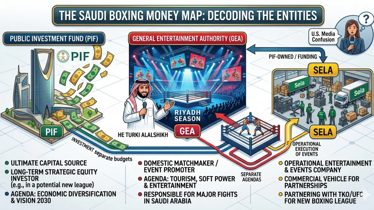 There are at least three Saudi entities involved in global sports right now, and they have separate budgets, separate leadership, and at times separate agendas. Anyone trying to read the boxing tea leaves needs to know which one is which.