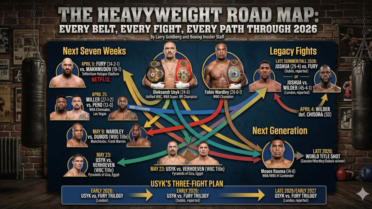 If Usyk follows this plan, the final stretch of his career runs through late 2026 and into 2027. The WBA mandatory situation could also factor in depending on the outcome of Miller vs. Pero on April 25.