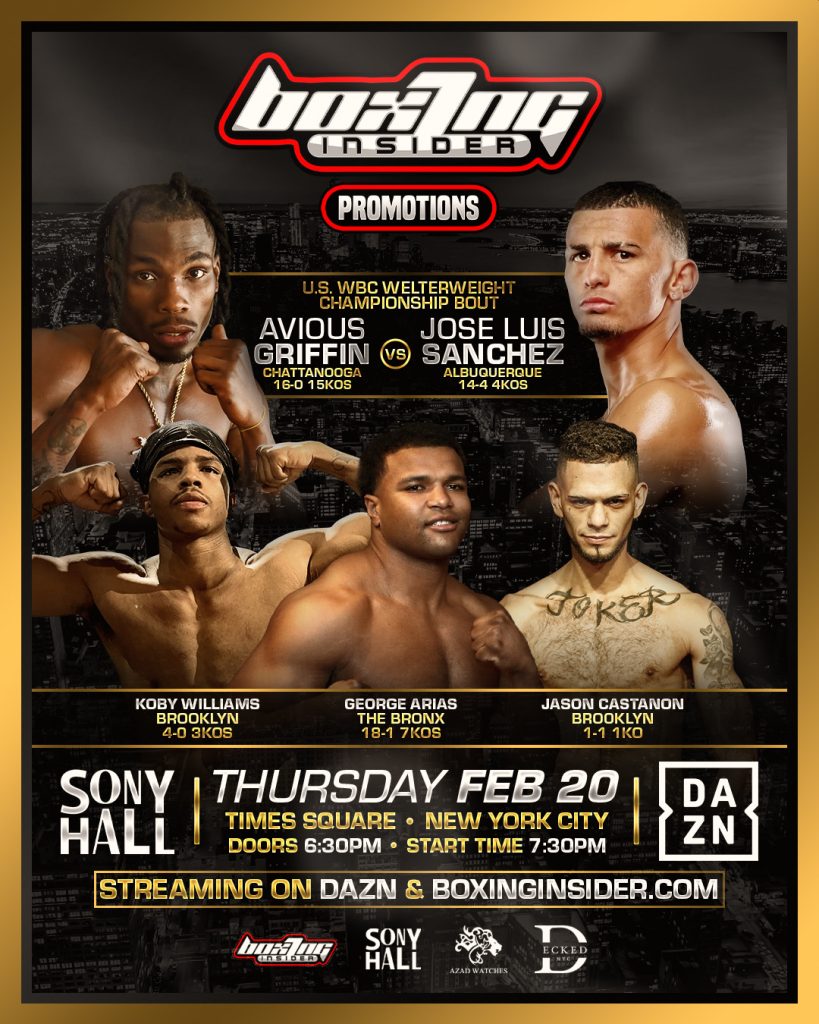 “New York City is experiencing a boxing resurgence with a string of some of the biggest events in the sport,” promoter Larry Goldberg said. “Avious Griffen stole the show the last 2 times he was featured on Boxing Insider events and this time he’s fighting his toughest opponent yet in a WBC US Title fight. We have a strong Heavyweight fight plus I’m very excited to feature 4-0 Koby Williams vs 5-0 Nicholas Isaac”